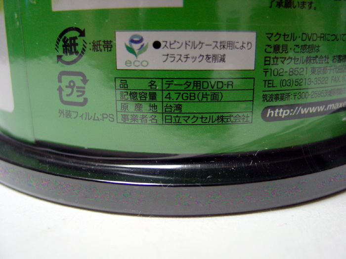 CD-R 650MB YUDEN x8 (x16対応) 15枚 Fuji x12 (誘電) 7枚 maxell x12 (MQ12) 137枚 Kodak x12 (金反射層) 8枚 Victor x16 (フタロ) 10枚 TDK x16 (フタロ) 5枚 SONY x48 (誘電) 25枚 --------------------------------------- 207枚 CD-R 700MB YAMADA (MITSUBISHI) x16(互換 AZO ) 240枚(30枚スピンドル) YAMAHA x16(誘電) 3枚 TDK x16(シアニン) 4枚 RICOH x20(台湾) 100枚 YUDEN x32(ひまわり) 11枚 SONY x32 (誘電) 7枚 SONY x48 (誘電) 30枚 YAMADA (MITSUBISHI) x48(ソニック AZO )39枚(50枚スピンドル) --------------------------------------- 434枚 ===================== CD-R メディア合計 641枚 ***************************************************************** DVD-R TDK x1 (ケース) 8枚 maxell x1 (ケース) 11枚 ---------------------------------------- 19枚 Fuji x4 TYG01 (ケース) 65枚 maxell x4 (ケース) 22枚 MITSUBISHI x4 (ケース) 1枚 ---------------------------------------- 88枚 TDK x8 TYG02 (50枚スピンドル) 50枚 Fuji x8 TYG02 (50枚スピンドル) 50枚 YUDEN x8 TYG02 (50枚スピンドル) 50枚 YUDEN x8 TYG02 (10枚スピンドル) 20枚 YUDEN x8 TYG02 (ケース) 40枚 SONY x8 TYG02 (ケース) 30枚 maxell x8 (50枚スピンドル) 50枚 maxell x8 台湾 (50枚スピンドル) 45枚 ZERO x8 (10枚スピンドル) 10枚 --------------------------------------- 345枚 MITSUBISHI x16 (50枚スピンドル) 50枚 ---------------------------------------- 50枚 ==================== DVD-R メディア合計 502枚 ***************************************************************** DVD+R RICOH x4 (ケース) 9枚 DVD+R DL maxell x2.4 (ケース) 5枚 DVD-RAM Panasonic 両面 TYPE2 1枚 Panasonic x3 (CPRM) 15枚 Panasonic x5 5枚 *****************************************************************