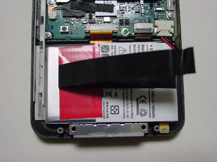 背面カバーを撤去すると電池が出て来ますのでテープとコネクタを外して撤去。