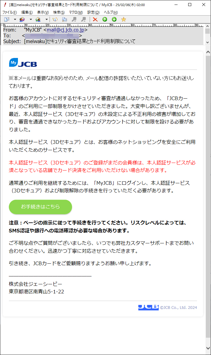 「お手続きはこちら」のリンク先が怪しいのと最後の JCB ロゴが切れている点。